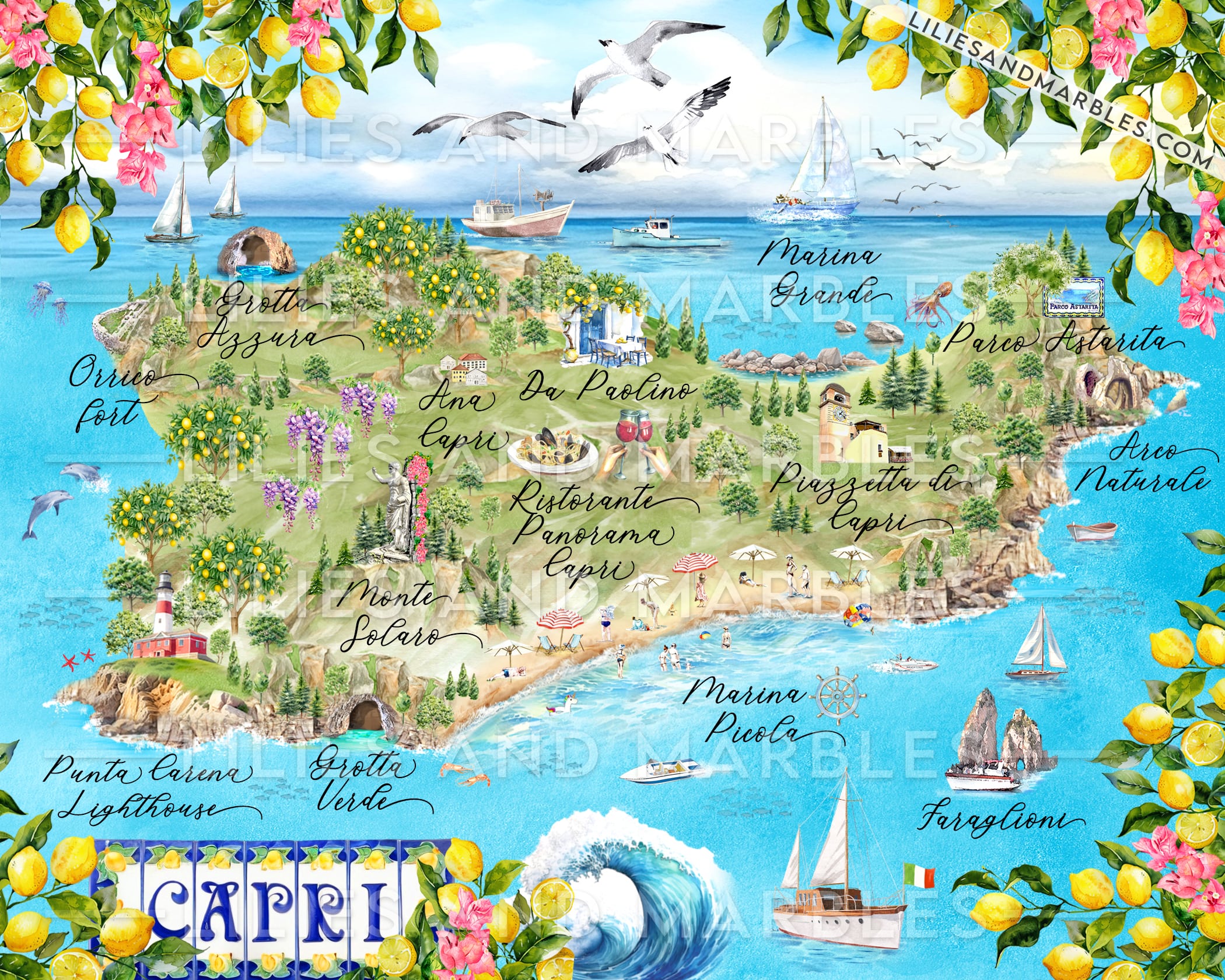 custom watercolor wedding map, custom wedding map, custom watercolor map, capri wedding map, lilies and marbles