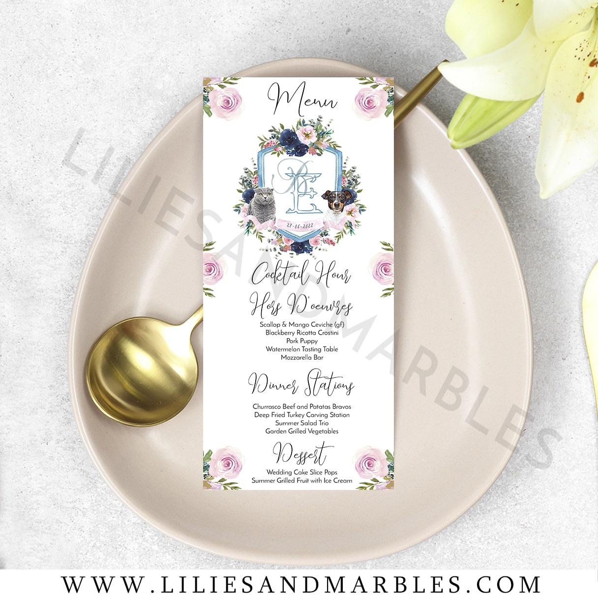 Purchase the product and choose the option you like. We will send over a questionnaire to get to know you better which will help us create a custom piece for you. In this wedding menu we offer your wording with a custom wedding crest and matching flower border.