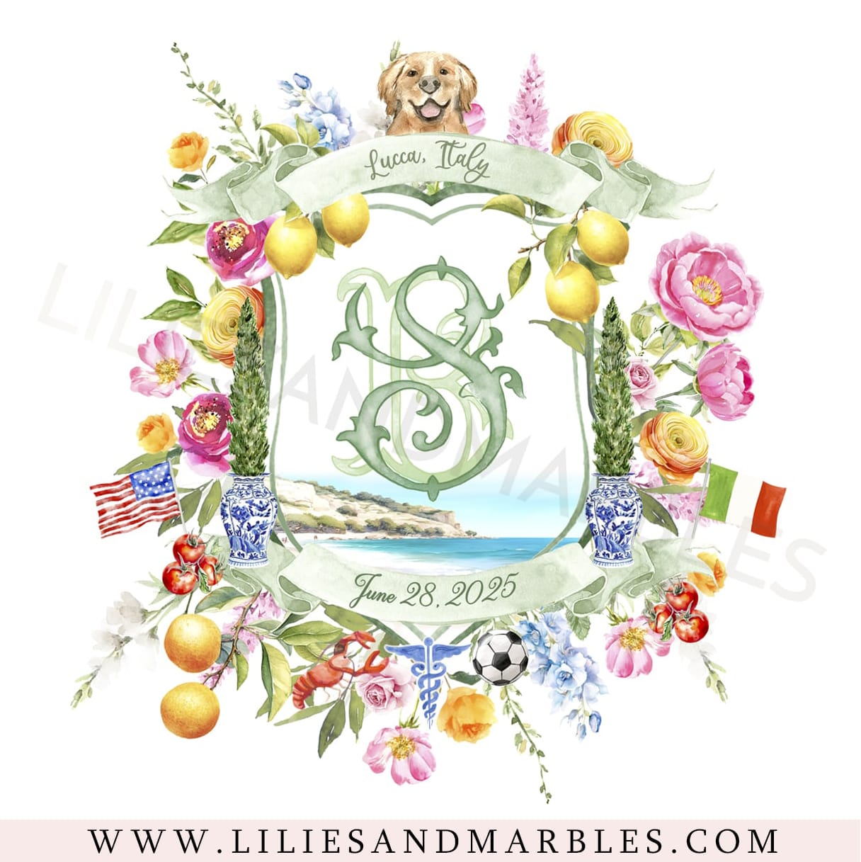 Custom watercolor crests are such a special addition to your wedding stationery and décor. They’re personal, meaningful, and can be used in so many beautiful ways from your invitations and Save the dates to cocktail napkins, wedding menus, wedding signage, mugs, pillows and more! Each crest is thoughtfully designed just for you, making it a special way to celebrate your love story and the new chapter you’re beginning together. We can include anything that’s meaningful to you, like your hobbies, location where you first met, your wedding venue, your pet and more, along with beautiful watercolor flowers from our library that match your wedding flowers and color palette perfectly! You’ll receive high-quality digital files, which means you can use your crest however you like. The possibilities are endless!  It’s all about making something that feels truly you. Please scroll down to read more about our design process, including the timeline, revisions, and everything else you need to know.